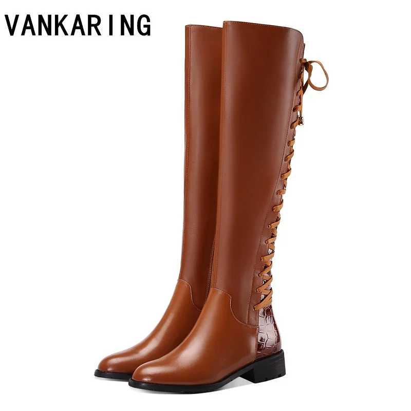 Beste Koop VANKARING merk vrouwen laarzen lederen + PU herfst winter laarzen vrouw zwarte schoenen hoge kwaliteit leer knie hoge rijden laarzen Goedkoop